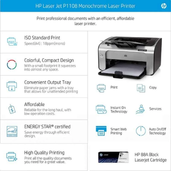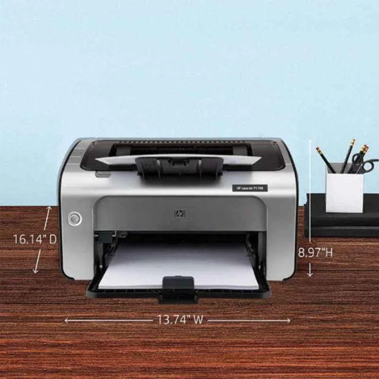 This HP P1108 LaserJet Pro Printer is perfect for small businesses and home offices. It prints at speeds up to 18 pages per minute, and has a 250-sheet input tray. The HP P1108 LaserJet Pro Printer is an all-in-one monochrome printer that is small and lightweight, making it perfect for use in a home or small office. It has a frequency of 60 Hz and dimensions of 349x238x196 mm without its stand. The printer can handle media with a weight of 60 to 163 g/m� and can produce output at a speed of up to 16 ppm.