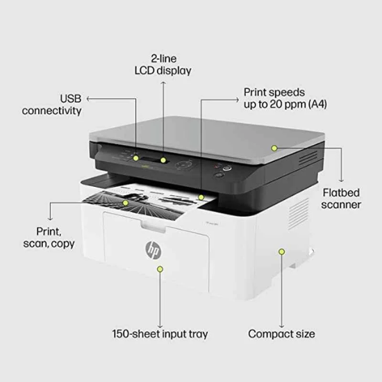 The HP Laser Printer is a high-quality all-in-one printer designed to provide efficient printing, scanning, and copying capabilities. With its sleek design and advanced features, this printer is a perfect addition to any home or office. Featuring USB connectivity, this printer allows for easy connection to your computer or laptop, ensuring seamless printing without any hassle. Whether you need to print important documents, scan receipts, or make copies of important paperwork, this printer has got you covered. With its monochrome output type, this printer delivers crisp and clear black and white prints, ensuring professional-looking documents every time. Boasting a print speed of up to 20 ppm for both monochrome and color, this printer ensures speedy and efficient printing, saving you valuable time. The HP Laser Printer is a reliable and versatile printer that meets all your printing needs. Whether you need to print, scan, or copy, this all-in-one printer has the functionality to handle it all.