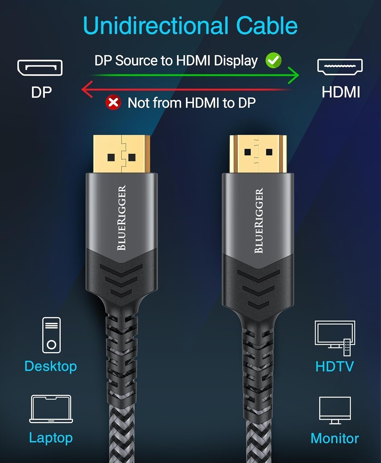 • WIDE COMPATIBILITY: BlueRigger display port to HDMI cable is compatible with Desktops, Laptops, PC, GPU for the DisplayPort, and TV, Projector, Monitor and VR Headset for the HDMI port
