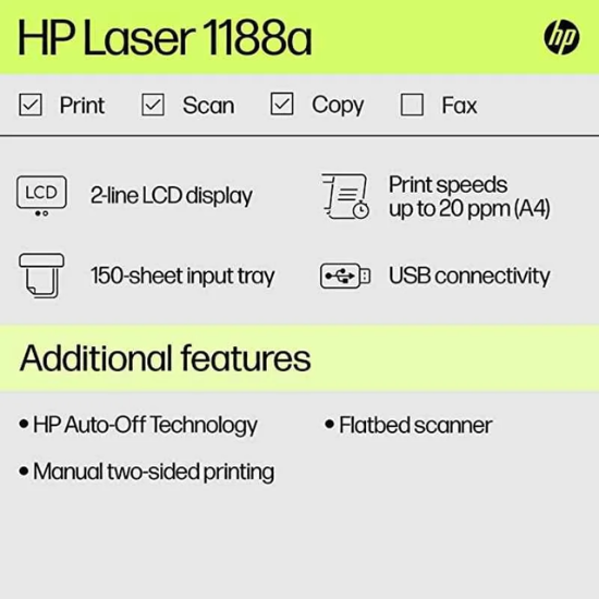 The HP Laser Printer is a high-quality all-in-one printer designed to provide efficient printing, scanning, and copying capabilities. With its sleek design and advanced features, this printer is a perfect addition to any home or office. Featuring USB connectivity, this printer allows for easy connection to your computer or laptop, ensuring seamless printing without any hassle. Whether you need to print important documents, scan receipts, or make copies of important paperwork, this printer has got you covered. With its monochrome output type, this printer delivers crisp and clear black and white prints, ensuring professional-looking documents every time. Boasting a print speed of up to 20 ppm for both monochrome and color, this printer ensures speedy and efficient printing, saving you valuable time. The HP Laser Printer is a reliable and versatile printer that meets all your printing needs. Whether you need to print, scan, or copy, this all-in-one printer has the functionality to handle it all.